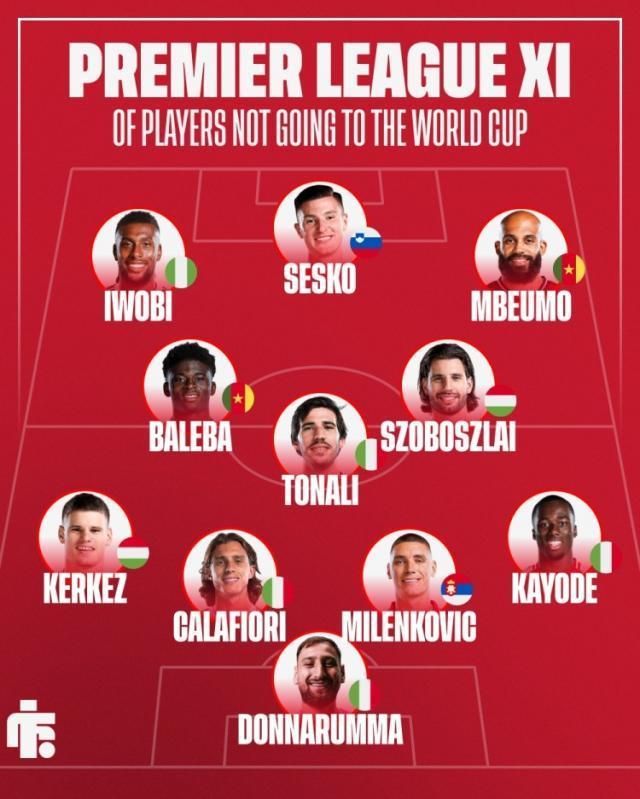 英媒评无缘世界杯英超11人:索博、托纳利、舍什科、姆伯莫在列